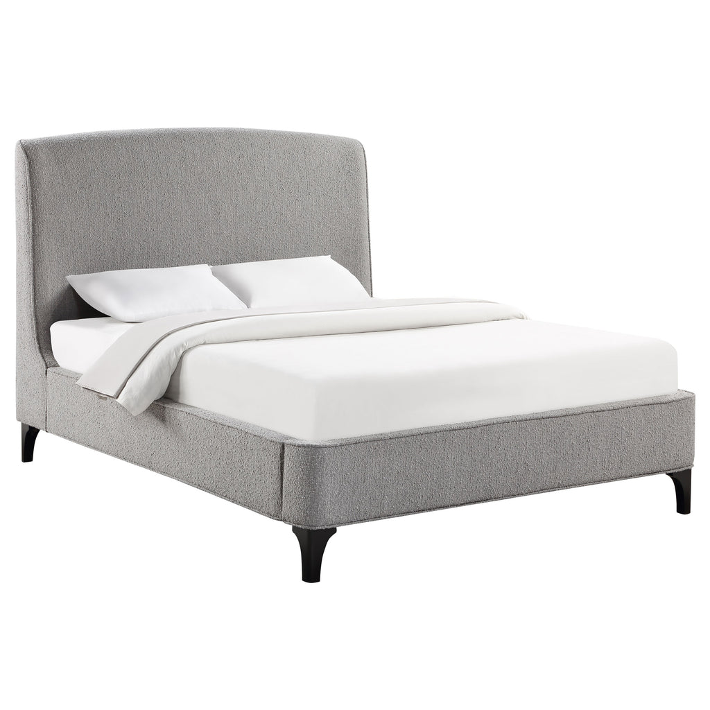 Add a touch of style and comfort to your bedroom with this upholstered bed. Its gentle curved headboard and thick sides are padded with trendy grey chunky boucle fabric. The whole frame is covered in the same soft fabric, creating a cozy and inviting look. The texture adds sophistication, making it a visually stunning piece that is both comfortable to sit on and admire from afar.