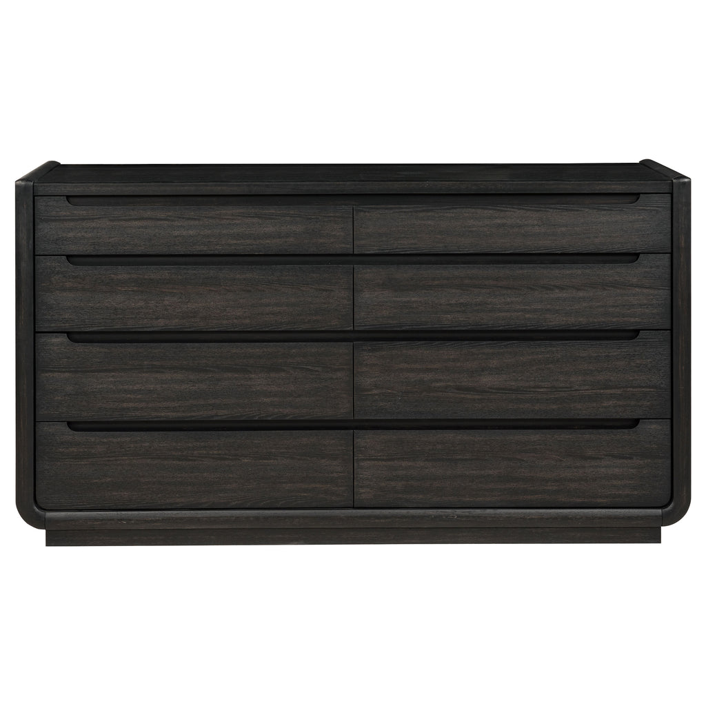 Defined by smooth curves and a rich burnished black finish, this eight-drawer dresser offers everyday functionality with refined simplicity. Its soft, rounded corners and minimalist drawer pulls speak to a modern sensibility, while black felt-lined top drawers cradle delicate pieces in quiet luxury. Soft-closing glides and dovetail joinery ensure lasting performance, while a dust panel base protects what’s tucked away. Crafted for balance and beauty, it’s both grounded and graceful. Key Features: • Eight-drawer dresser finished in burnished black for a bold, elegant bedroom foundation • Curved edge design and recessed pulls soften the overall silhouette • Top drawers lined in black felt to protect jewelry, watches, or accessories • Heavy-duty soft-closing ball bearing glides ensure smooth, quiet drawer use • English dovetail drawer construction adds strength and craftsmanship to design • Dust panel construction keeps contents clean and enclosed at the base