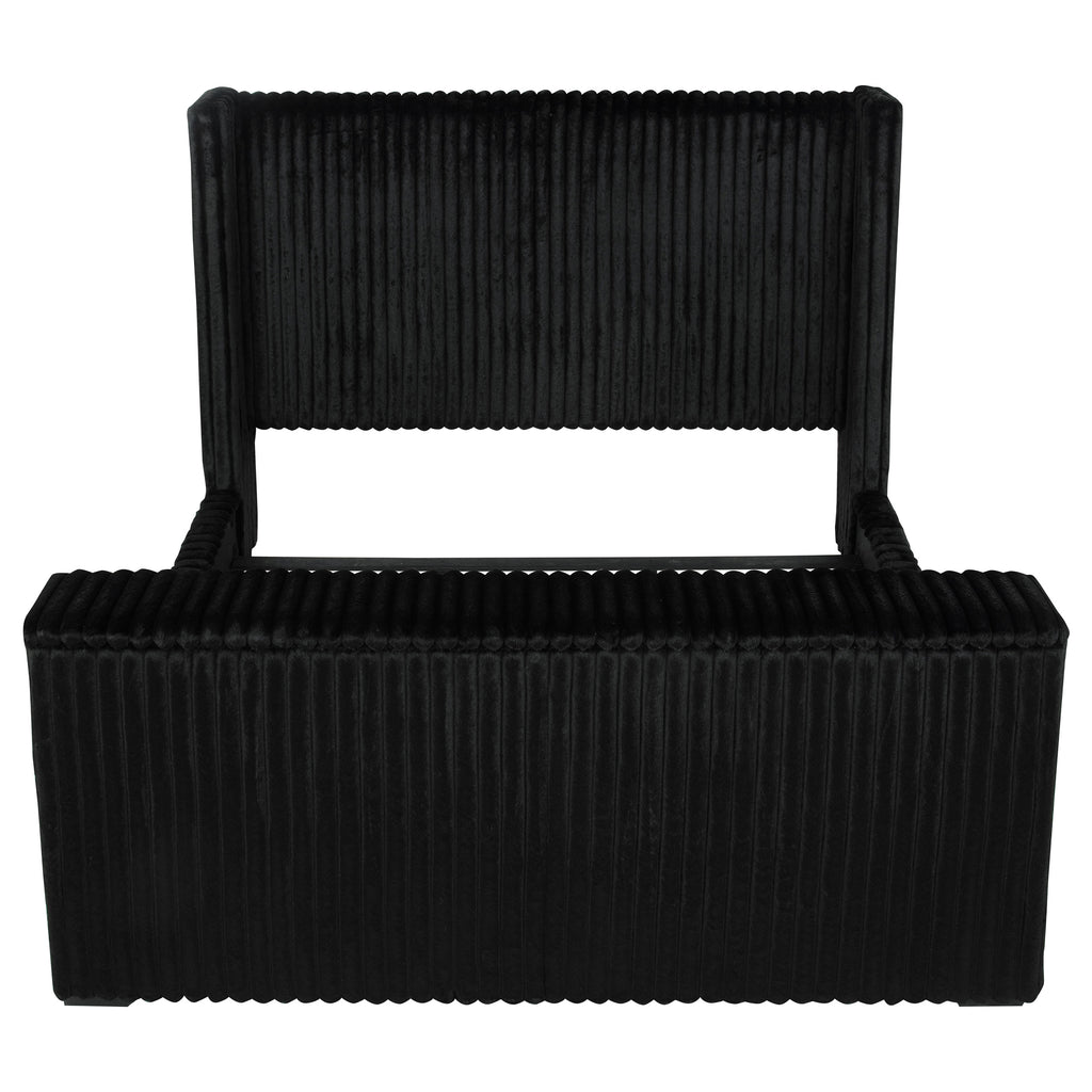 Unveil a new chapter of indulgence with this velvet wingback bed, where high style meets high tech. Richly upholstered in decadent black velvet, its vertical channeled frame embraces you in plush softness. Hidden within the footboard, a concealed TV lift fits up to 50-inch TVs and rises with the push of a button. A built-in power outlet with three AC ports adds plug-and-play convenience. This bed transforms any room into a sanctuary of luxury, beauty, and cinematic escape. Key Features: • Queen bed with tall wingback frame and vertical channel tufting in black velvet • Built-in TV lift mechanism accommodates TVs up to fifty inches in size • Three-outlet AC power strip hidden in footboard for seamless device connection • Plush velvet upholstery adds glam texture to the sculptural modern silhouette • Foam-padded and fully upholstered for comfort and a clean, finished look • Crafted from birch, engineered wood, and plywood for durability and support