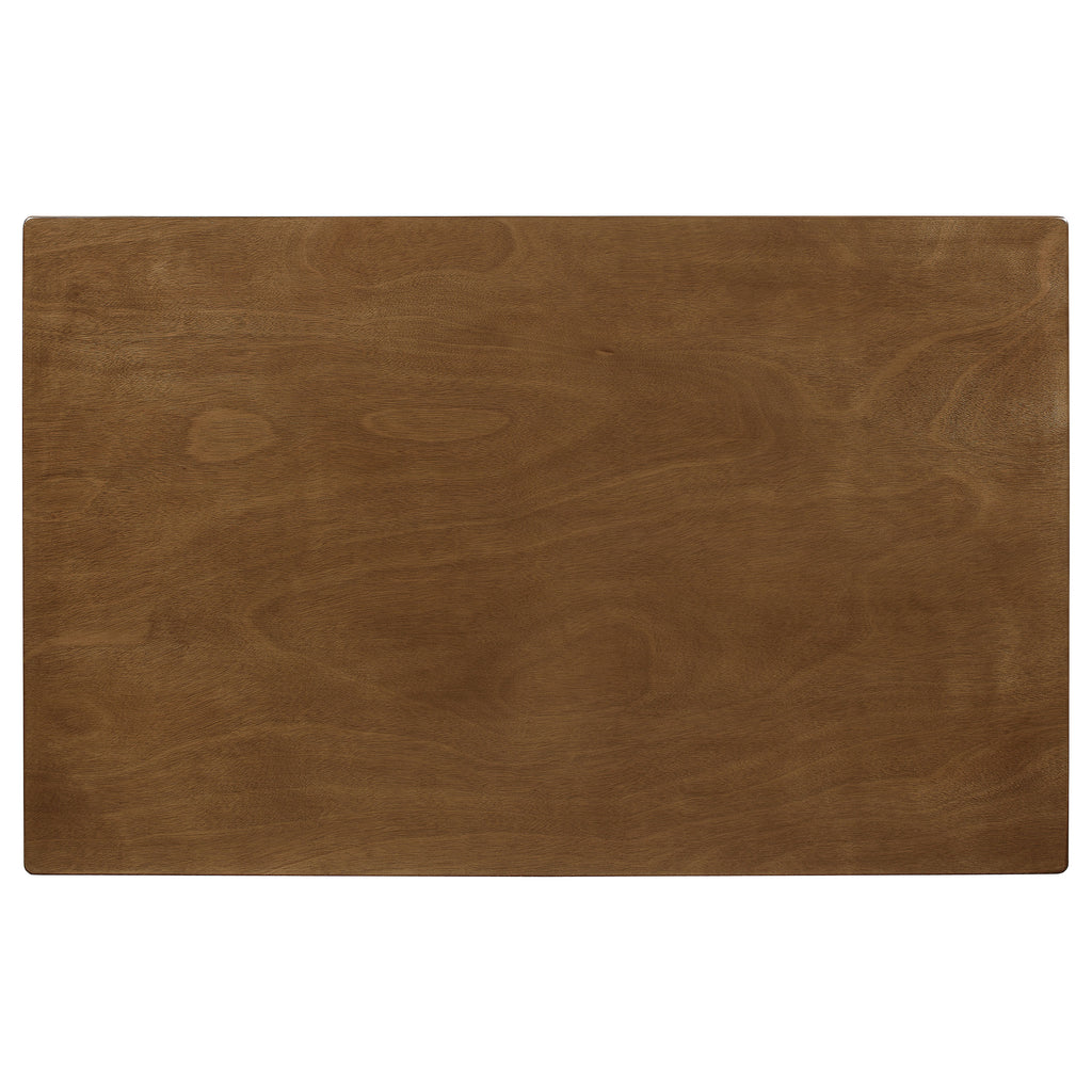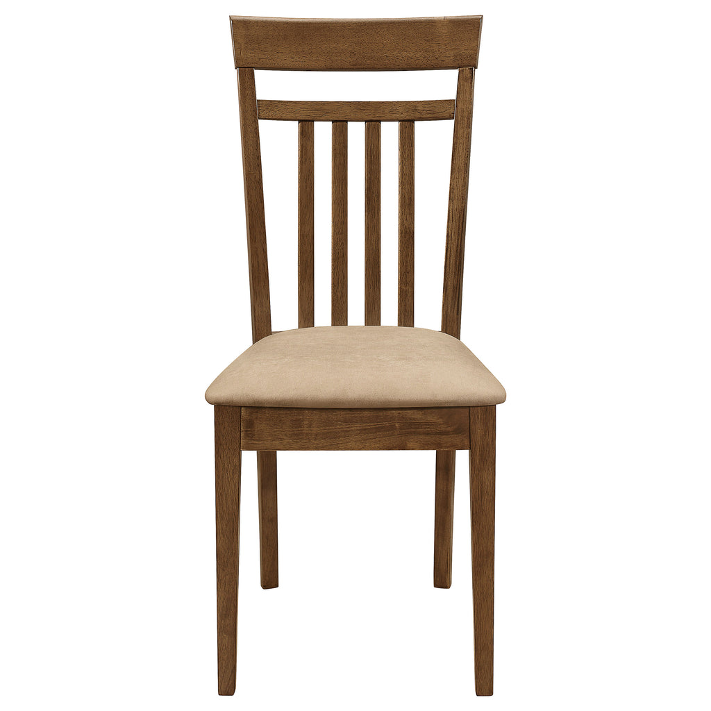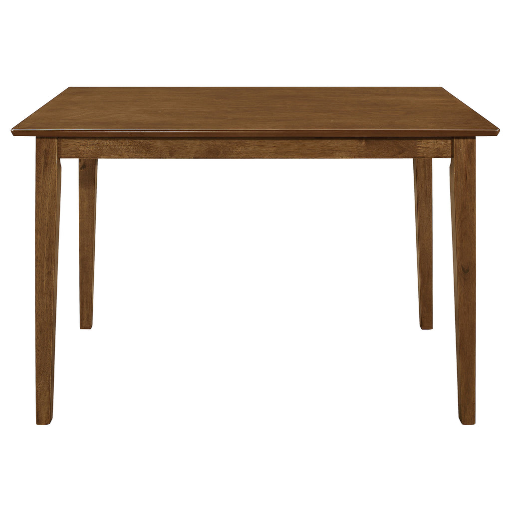 Bring casual sophistication to your dining area with this five-piece dining set. The rectangular table features clean lines and tapered legs, offering a timeless look that complements transitional spaces. Each chair showcases a classic slatted back design for added support and style. Plush cushioned seats upholstered in soft beige microfiber enhance comfort. Crafted from solid rubberwood, engineered wood, and okume veneer, this dining set provides lasting beauty for everyday dining. Key Features: • Dining set includes rectangular table and four mission style dining chairs • Crafted of rubberwood, engineered wood, and okume veneer for strength • Warm chestnut finish enhances the natural texture of the wood grain • Mission style chairs feature slatted backs with supportive contours • Soft beige padded seats upholstered in microfiber for lasting comfort • Square tapered legs offer balance and stability to the timeless design