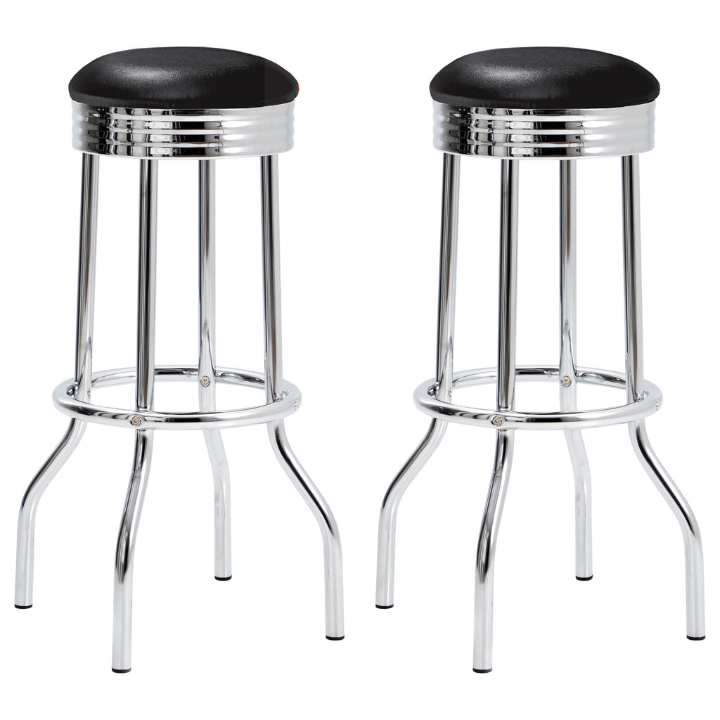 Bring nostalgic charm to your home with this retro swivel bar stool, blending diner-inspired design with modern comfort. A round padded seat in white leatherette pairs effortlessly with a ribbed chrome apron for vintage appeal. The electroplated chrome base provides stability with flared legs and a supportive footrest. Crafted from heavy gauge metal and cushioned with foam, it offers smooth 360-degree swivel functionality perfect for everyday use. Key Features: • Retro-style swivel bar stool adds vintage appeal to casual dining spaces • Electroplated chrome base features ribbed apron for iconic mid-century flair • Smooth 360-degree swivel function provides flexible seating and easy movement • Padded round seat upholstered in soft, easy-to-clean white leatherette • Durable construction with heavy-gauge metal and supportive foam cushioning • Circular footrest and flared legs offer added stability and timeless style
