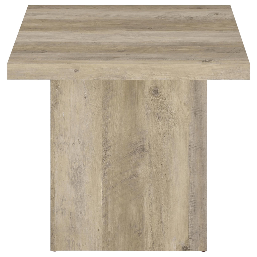 The simplicity of a versatile and nature-inspired addition to casual spaces whets your appetite and keeps you focused on where to place this modern end table. Sidled up to a chair or sofa, or standing alone, the accent side table is in touch with the rustic side of décor created to add an earthy influence. Natural mango finish wood products and hollow board construction showcases the authentic look of wood grain striping. Clean lines flatter a square tabletop and oversized block base, adding a low-key yet attractive ambiance ideal for your easy-living rooms. Use this table to accompany a seating piece or as a standalone display table for plants and décor. Key Features: • End table crafted from engineered wood with laminate veneer for long-lasting quality • Features a natural mango wood look with wood grain markings for rustic charm • Square tabletop and oversized block base offer modern style and stability • Low-profile design adds a clean, casual aesthetic to living room settings • Eco-friendly laminate veneer creates a durable, scratch-resistant surface • Perfect as a side table next to a chair or sofa, or as a standalone display piece