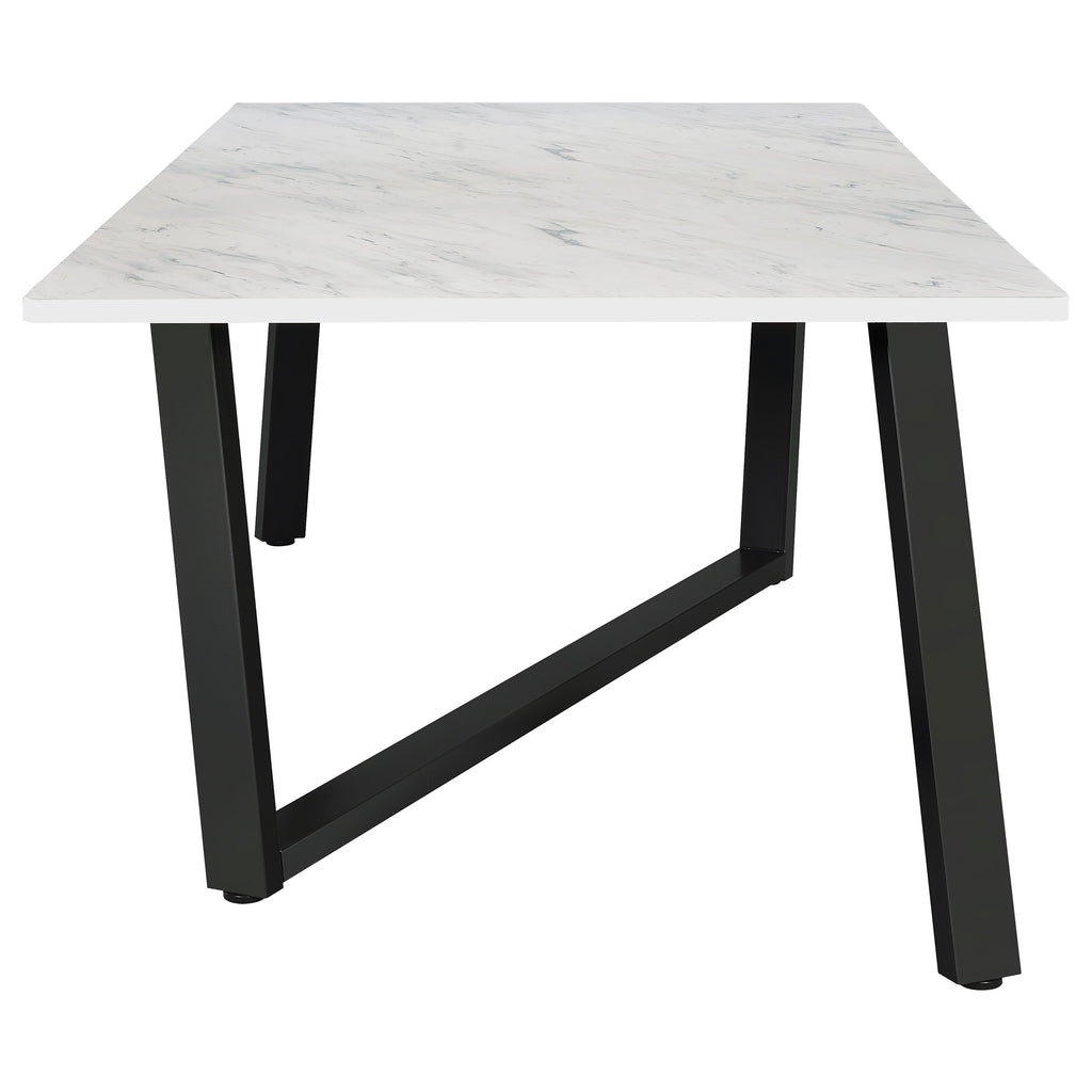 Strikingly modern with a classic twist, this dining table features a spacious faux marble top and an asymmetrical gunmetal metal base. The clean white surface offers the elegant look of marble with easy-care convenience, while the bold leg design brings architectural flair. Built for up to six guests, this table makes a dramatic statement in contemporary dining rooms or open-concept layouts. Key Features: • Contemporary rectangular dining table with sculptural metal base design • White faux marble tabletop offers a sleek, high-end look with easy maintenance • Gunmetal-finished metal legs provide stability and a bold, industrial accent • Asymmetrical leg placement adds a modern architectural element • Made with engineered wood and scratch-resistant, eco-friendly laminate veneer • Comfortably seats up to six guests, ideal for family meals or stylish entertaining