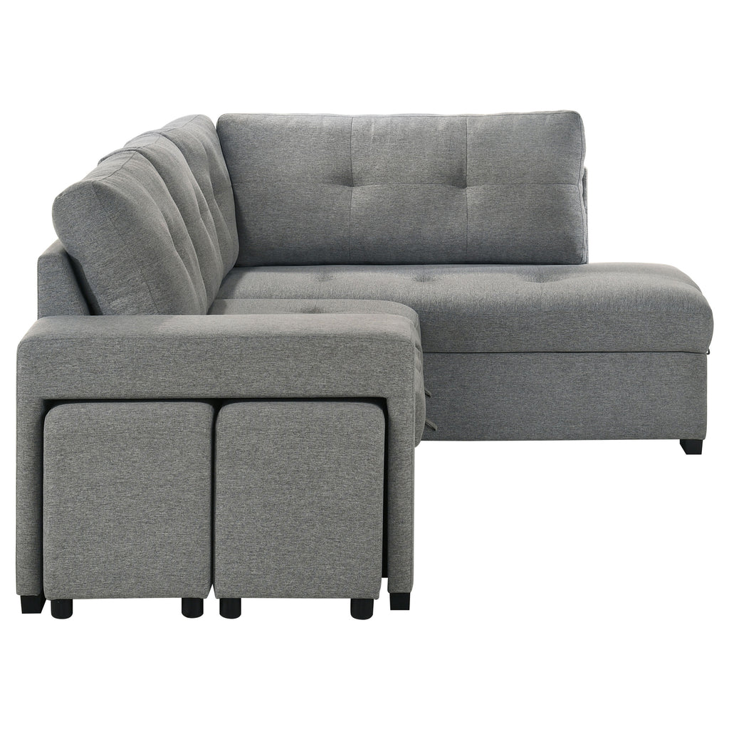 Effortlessly blending beauty and utility, this sleeper sectional invites you to unwind in tailored comfort. Draped in soft grey fabric, its tufted cushions exude quiet elegance, while the generous silhouette offers space to stretch, gather, or dream. Two upholstered stools nest neatly within the armrest, ready for extra seating in an instant. A pull-out bed welcomes overnight guests, and the chaise conceals spacious hidden storage—perfectly designed for life lived beautifully. Key Features: • Sleeper sectional sofa with tufted cushions and clean lines for stylish relaxation • Grey fabric upholstery brings soft texture and versatile modern charm • Pull-out sleeper bed transforms the sofa into a cozy guest accommodation • Lift-up chaise conceals hidden storage for blankets, pillows, or everyday needs • Includes two upholstered stools that nest seamlessly into the sofa armrest • Perfect for compact spaces needing elegant form, comfort, and flexible seating