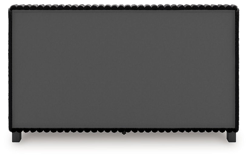 If glitz and glam are your jam, you’re gonna love this queen upholstered panel bed. Gleaming glitter and dazzling chrome-tone touches are paired with tufted black faux fur for a stunning pop of pizzazz. Loaded with chic flair and serious sparkle, it's a simply splendid way to wake up your inner sanctum’s style.