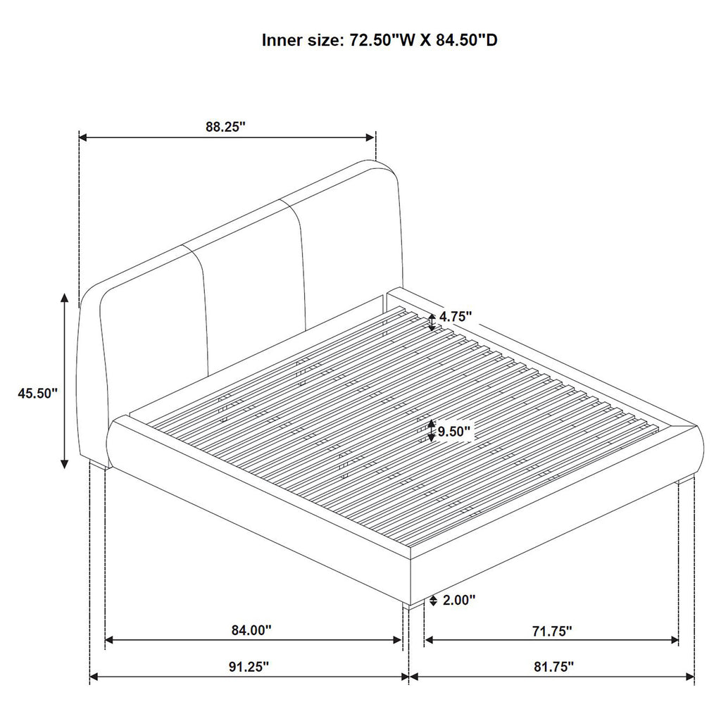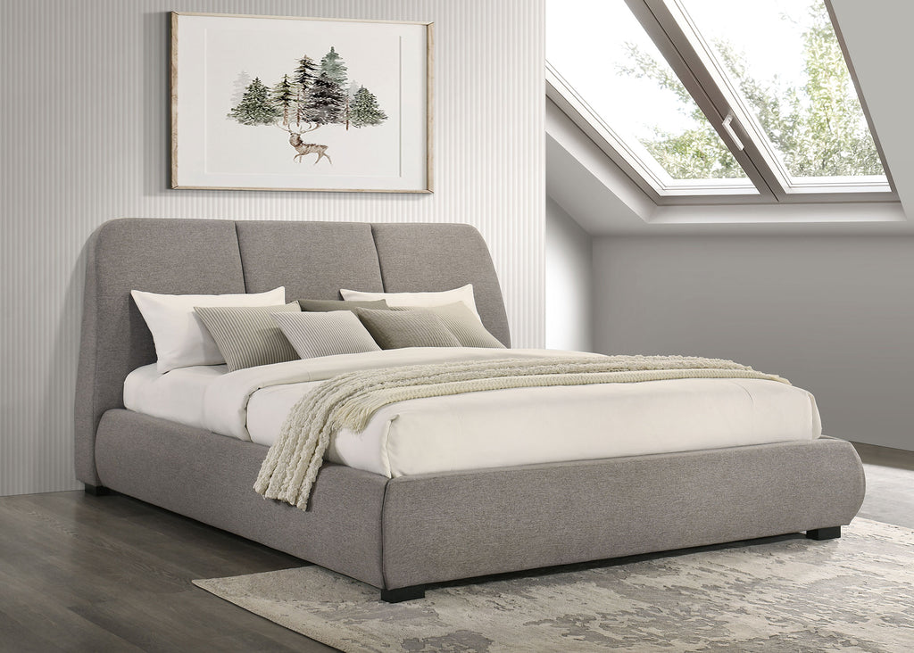 Softly sculpted and thoughtfully tailored, this upholstered platform bed brings a quiet elegance to modern sleep spaces. Its curved silhouette flows from a gently flared headboard to rounded side rails, offering a sense of movement and ease. Three stitched panels add subtle dimension, while the built-in slat system provides durable mattress support without the need for a foundation. Crafted from solid and engineered wood, it balances sculptural form with everyday comfort. Key Features: • Queen platform bed with curved lines and stitched headboard for soft modern design • Taupe fabric upholstery offers warm texture with a clean, neutral visual tone • Sculpted frame flows from the rounded headboard to the low-profile foot rails • Slatted base eliminates the need for a foundation or box spring beneath mattress • Crafted from solid wood, engineered wood, foam, and upholstered in soft fabric • Perfect for modern bedrooms seeking balance between form, texture, and function