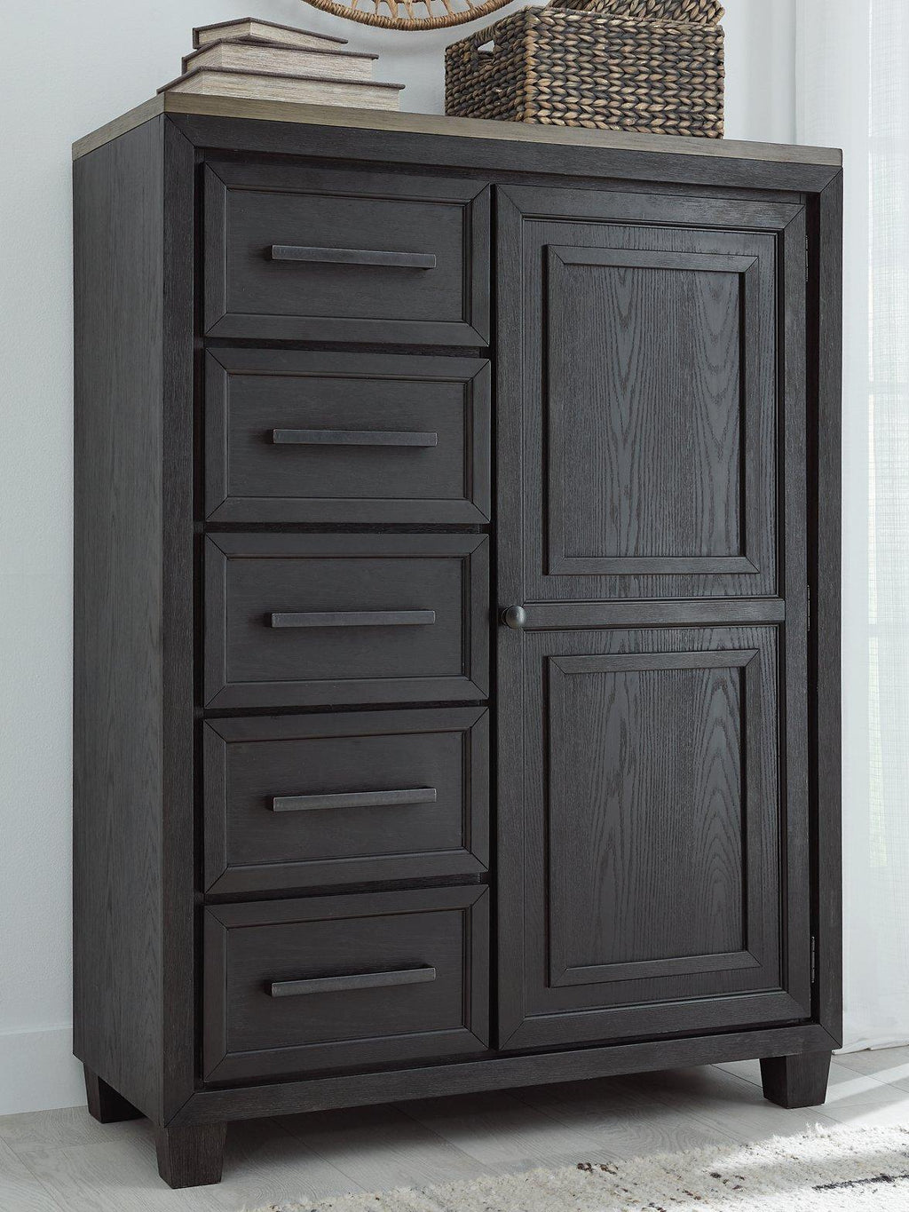 This door chest is casual contemporary style simply done right. Its two-tone color scheme features a rich brushed black main color accented with a beautiful dusty grayish brown wood tone. And there's plenty of storage to accommodate your wardrobe needs with ease. The dresser has 5 soft-close drawers, and behind the door you'll find pull-out trays for shoes or other accessories, along with shelving for bulky items.
